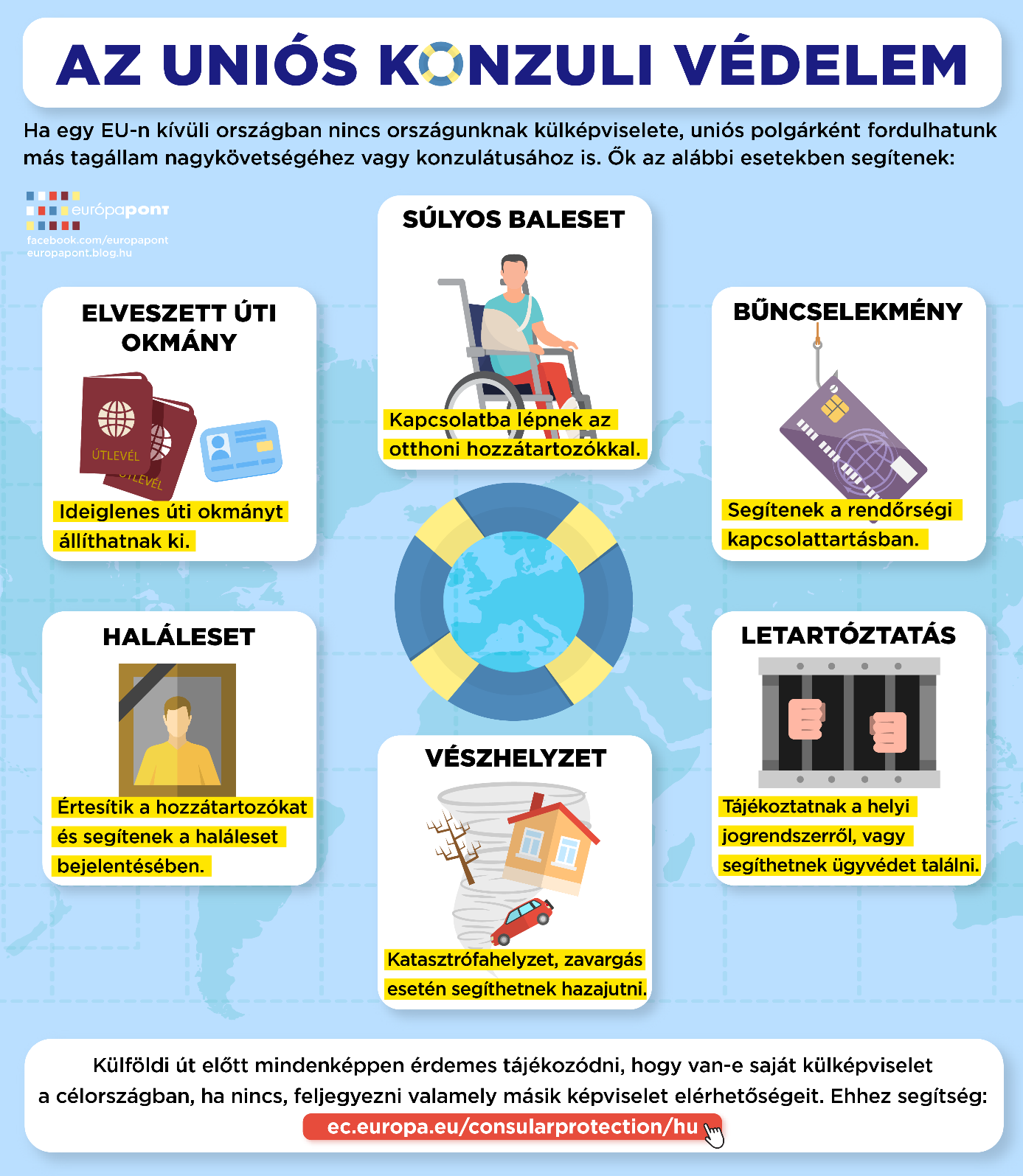 Ha nincs magyar képviselet valamelyik országban, úgy másik tagállam konzuli szolgálatának segítségét kérhetjük például súlyos baleset vagy betegség esetén, halálesettel, letartóztatással, fogva tartással kapcsolatos ügyekben, vagy ha erőszakos bűncselekmény áldozatává válnánk. Természeti katasztrófa – például földrengés, szökőár, vulkánkitörés – és polgári zavargás esetén segítenek a hazaszállításban is, de a leggyakoribb eset az elveszett vagy ellopott úti okmány pótlása. Ilyenkor ideiglenes úti okmányt állítanak ki, hogy a kérelmező biztonságosan hazautazhasson. (Az uniós intézmények nemrégiben fogadták el a javaslatot, amely alapján a közeljövőben ezek az ideiglenes dokumentumok egységesek lesznek.)