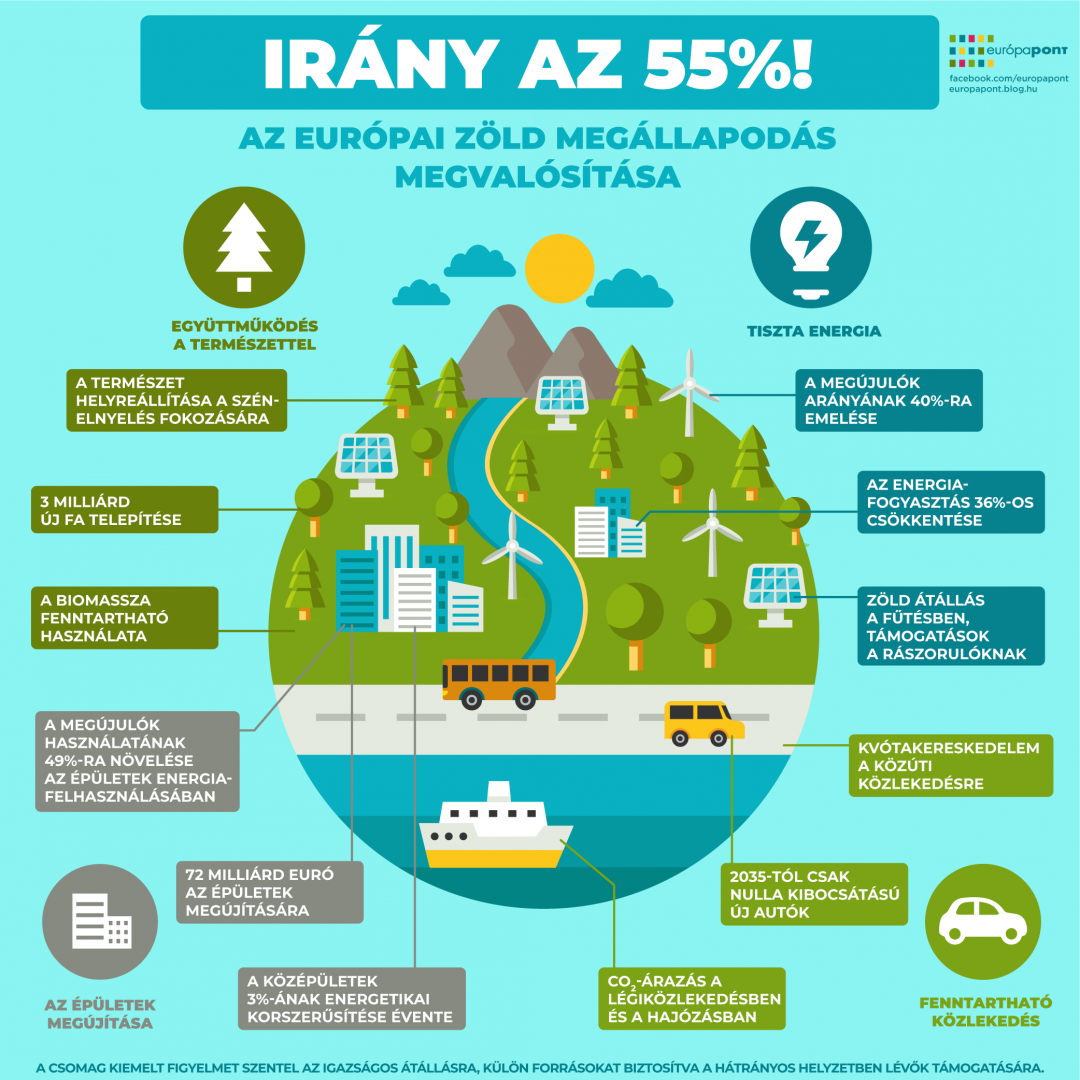 Mind a 27 uniós tagállam elkötelezte magát amellett, hogy 2050-re – a világon elsőként – a kontinensen megvalósítsa a klímasemlegességet. Az ehhez vezető fontos lépés, hogy az EU 2030-ig az 1990-es szinthez képest legalább 55%-kal csökkentse az üvegházhatású gázok nettó kibocsátását, ahogyan azt az uniós európai klímarendelet rögzíti. (Az üvegházhatásúgáz-kibocsátás az 1990-es szinthez képest eddig 24 százalékkal csökkent, miközben az EU gazdasága ugyanebben az időszakban körülbelül 60 százalékkal nőtt, függetlenítve a gazdasági növekedést a kibocsátásoktól.) A Bizottság július 14-én az angolul „Fit for 55”, magyarul „Irány az 55%!” elnevezésű csomagjában konkrét intézkedéseket terjesztett elő. Ezek mind az európai zöld megállapodás megvalósítását szolgálják, és együtt lehetővé teszik, hogy Európa 2050-re valóban klímasemlegessé váljon, azaz tevékenységeivel teljes mértékben semlegesítse üvegházhatásúgáz-kibocsátást. A csomag kiemelt figyelmet szentel annak, hogy ne a szegényebb, hátrányos helyzetben lévők fizessék meg a zöld átállás árát, ehhez külön forrásokat is rendel.