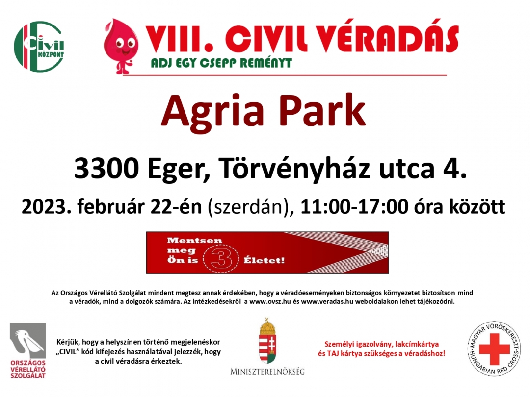 Adj egy csepp reményt! - VIII. Civil Véradás két helyszínen Heves megyében, Egerben és Gyöngyösön 2023. február 22-én. Részletek a cikkben.