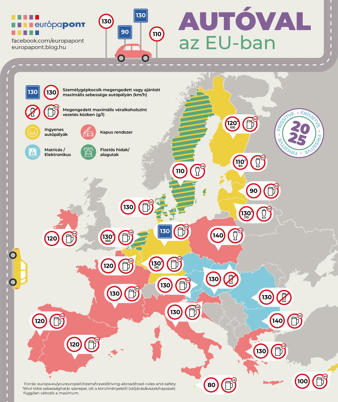 Itt a nyár, és itt van újra az Európa Pont autóstérképe. Ha kocsival vágsz neki az útnak, a térkép frissített adataiból megismerheted a vezetés feltételeit tagállamonként – például azt, kell-e fizetni az úthasználatért és hogyan, esetleg megihatsz-e egy pohár bort a vacsorához, ha még vezetsz. Az infografikán látható, személyautóval mennyi a megengedett legnagyobb sebesség autópályán vagy ennek híján a legmagasabb rangú úttípuson. Ahol a táblán két sebességet is feltüntettünk, ott az évszaktól, napszaktól vagy időjárástól függően több maximális sebességhatárt is alkalmaznak, nyáron és éjszaka általában magasabb sebesség engedélyezett.