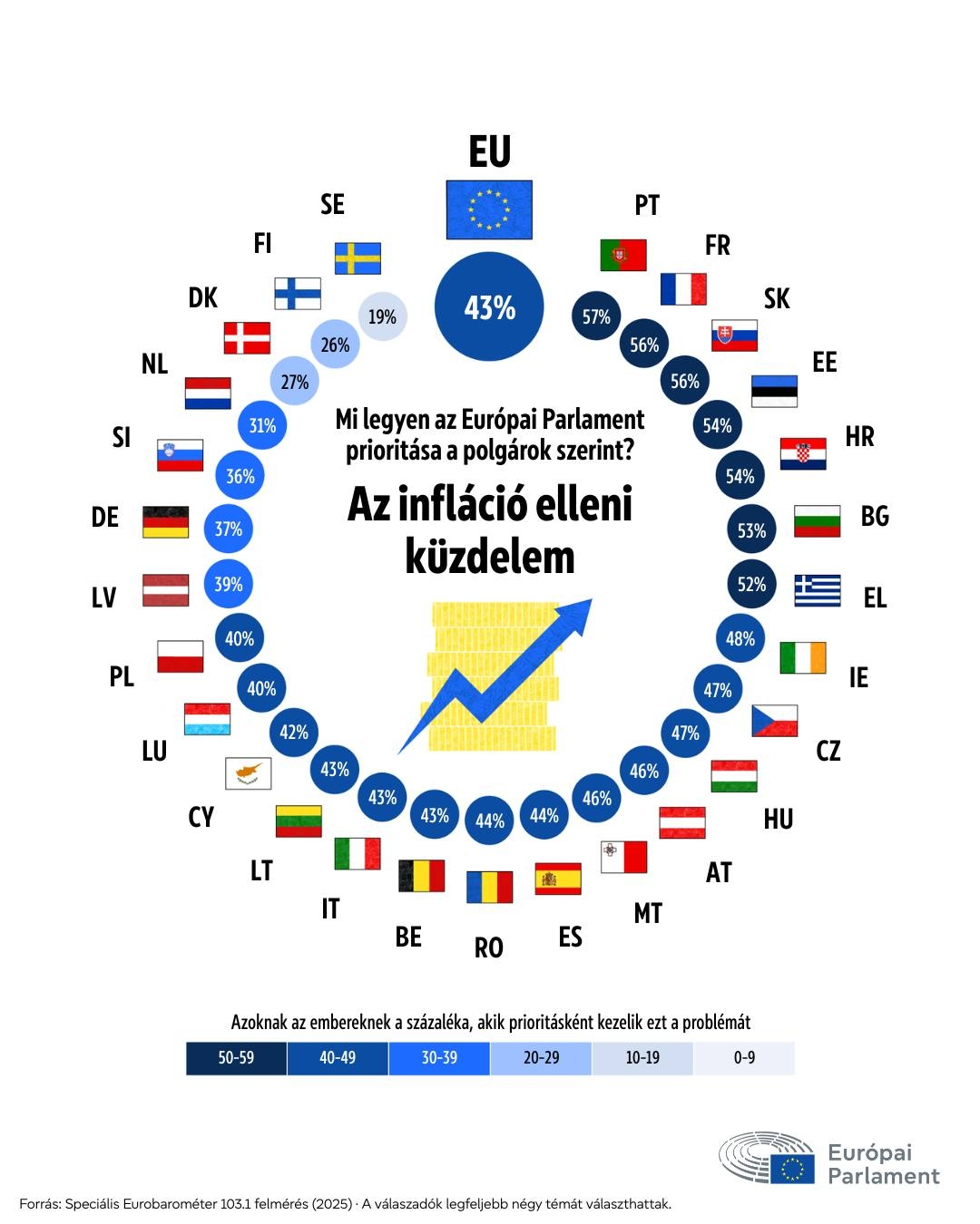 43% sürgeti az Európai Parlamentet, hogy kezelje prioritásként az infláció, az emelkedő árak és a megélhetési költségek kezelését. A következő helyen az EU védelme és biztonsága, valamint a szegénység és a társadalmi kirekesztés elleni küzdelem áll (mindkettő 31%-kal).