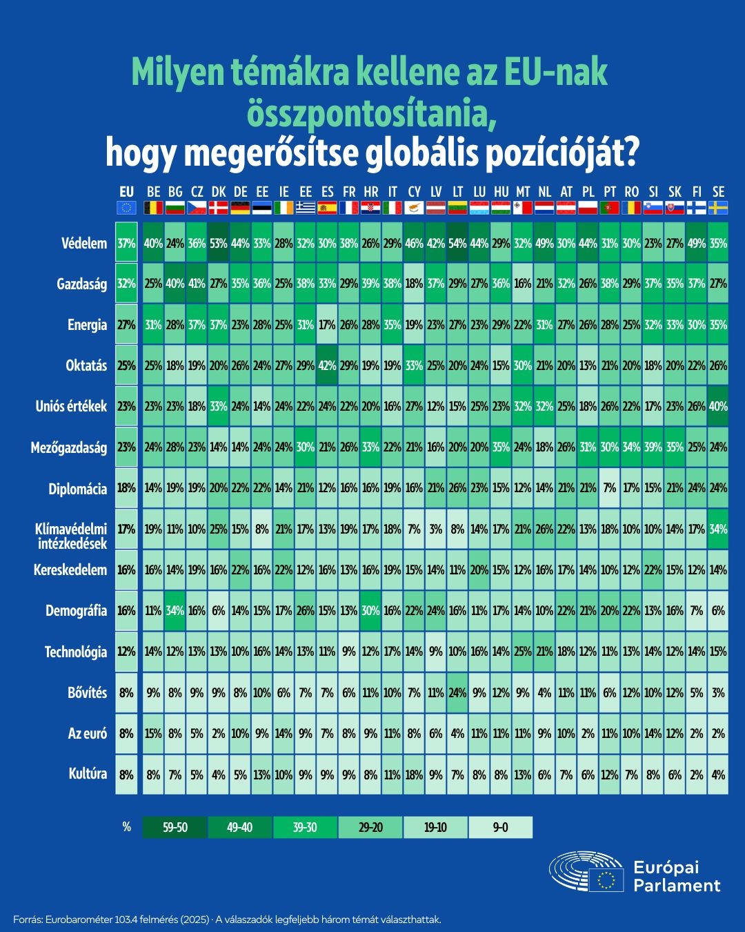 A magyar válaszadók szerint a versenyképesség, gazdaság és ipar (36%) mellett az élelmiszer-biztonság és mezőgazdaság (35%) az terület, amelyre az EU-nak leginkább összpontosítania kellene ahhoz, hogy megerősítse pozícióját a világban. (Az élelmiszer-biztonságot és mezőgazdaságot megnevező magyar válaszadók aránya 8 százalékkal nőtt a 2025. januári Eurobarométer felmérés eredményeihez képest.) A védelem és biztonság a harmadik helyen végzett (29%), holtversenyben az energiafüggetlenség, erőforrások és infrastruktúra (29%) területekkel.