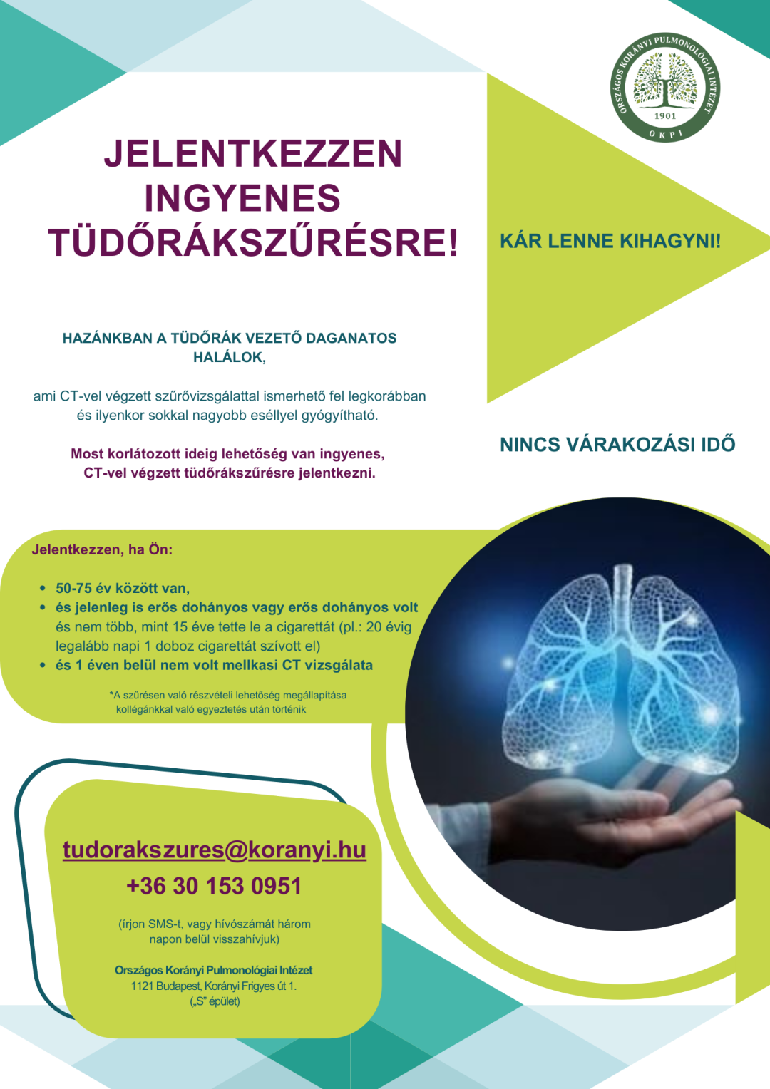 Az Országos Korányi Pulmonológiai Intézet csatlakozott ahhoz az európai uniós kezdeményezéshez, amelynek keretében közel 3000 ember ingyenes CT-vel végzett tüdőrák-szűrése végezhető el. Hazánkban a tüdőrák vezető daganatos halálok, amelynek az egyik oka, hogy túl későn ismerjük fel a betegséget. A korai stádiumban felismert betegséget, jobb eséllyel lehet gyógyítani, a korai diagnózis rengeteg életet menthet meg.