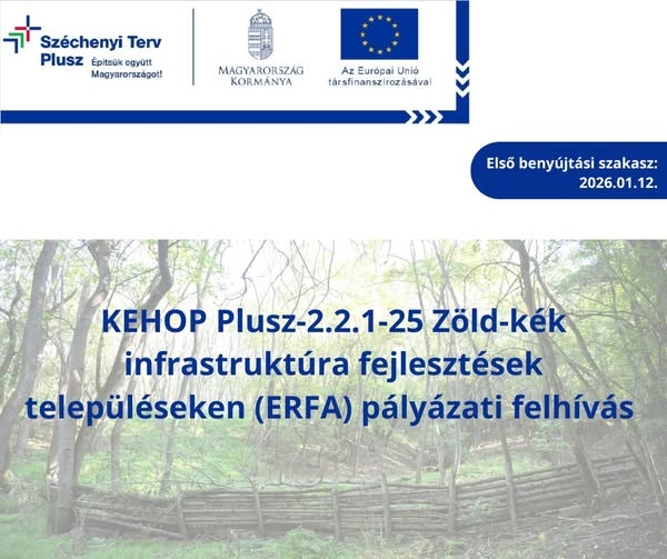 Megjelent a „KEHOP Plusz-2.2.1-25 – Zöld-kék infrastruktúra fejlesztések településeken (ERFA)” című pályázati felhívás, amely a települési vízgazdálkodási problémák természetalapú, zöldinfrastruktúra-fejlesztésekkel történő megoldását támogatja.
